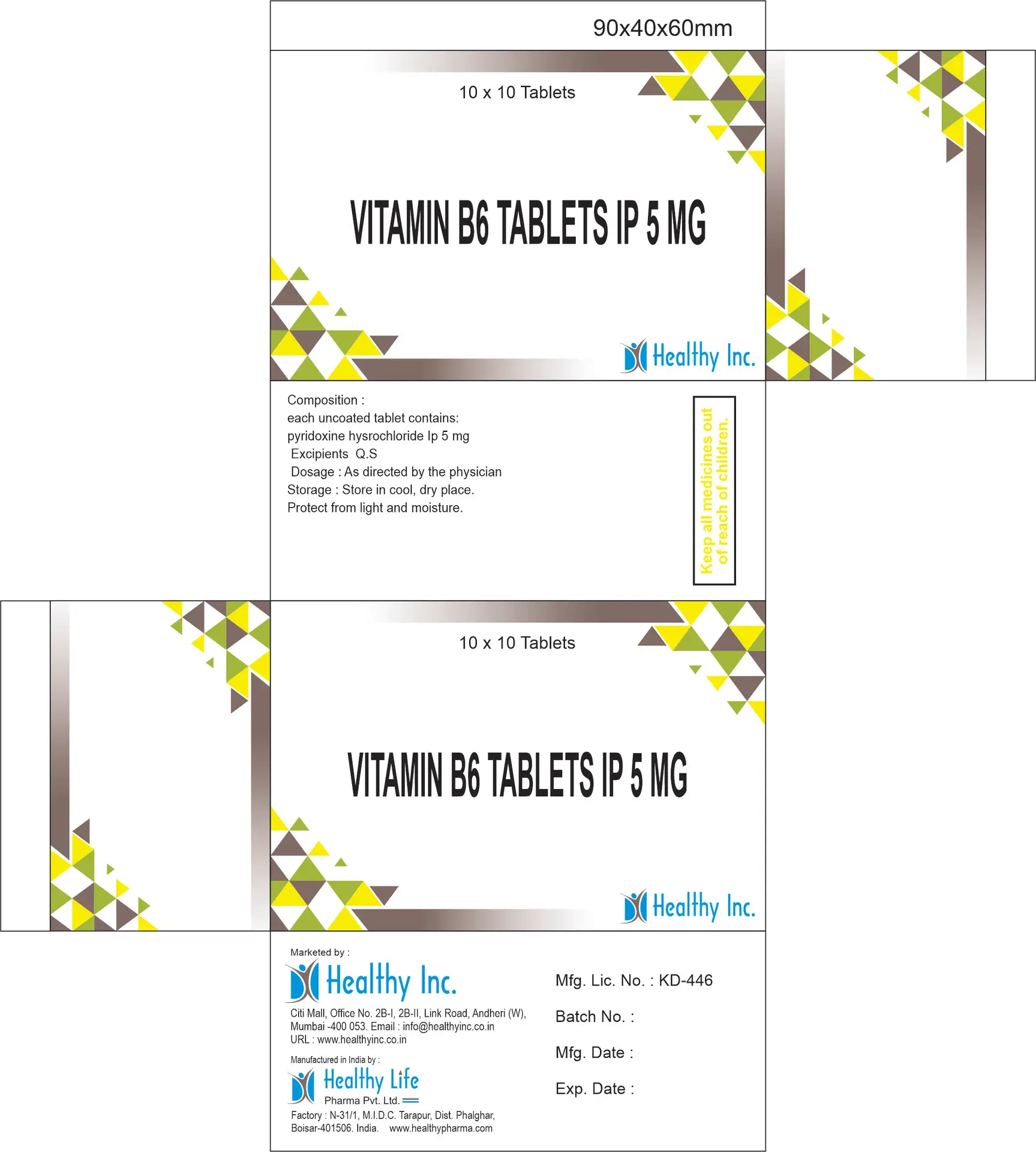 Q: Who manufactures Vitamin B6 Tablets? A: Healthy Life Pharma Pvt. Ltd. manufactures them in India.